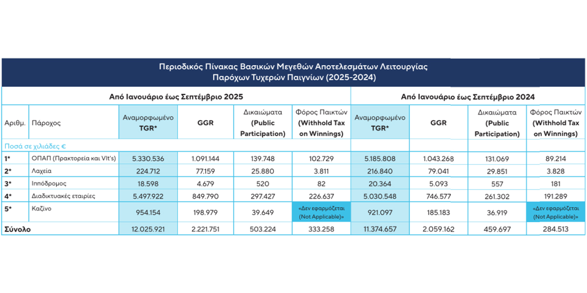 Σύμφωνα με τα στοιχεία που δημοσίευση η ΕΕΕΠ στο πρόσφατο newsletter της για το διάστημα του Ιανουαρίου – Σεπτεμβρίου 2025, η αγορά τυχερών παιγνίων παρουσιάζει σημαντική αύξηση σε σχέση με το αντίστοιχο περσινό διάστημα. Τα συνολικά πονταρίσματα TGR ανήλθαν στα 12,03 δισ. ευρώ, έναντι 11,37 δισ. το 2024, σημειώνοντας άνοδο σχεδόν 650 εκατ. ευρώ.