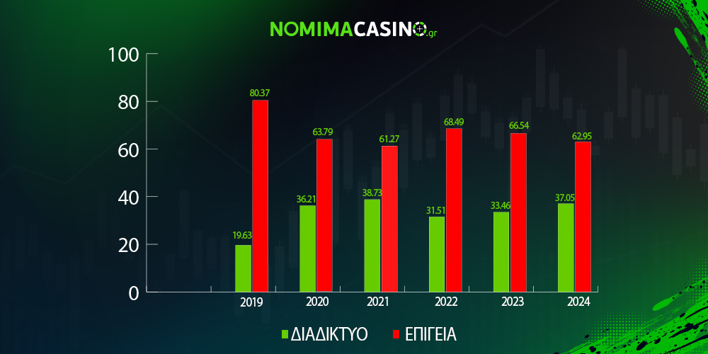 Στον παρακάτω πίνακα φαίνοται τα ποσοστά συμμετοχής (στο συνολικό GGR) των διαδικτυακών και των επίγειων εταιρειών που προσφέρουν υπηρεσίες τυχερών παιχνιδιών.